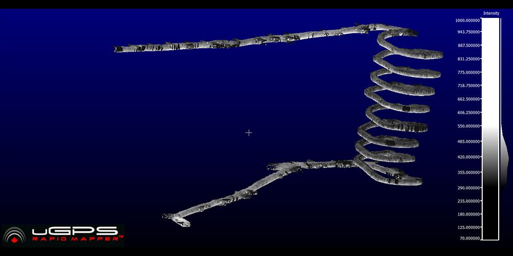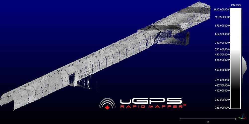 Applications include: the augmentation of routine shaft inspections with a uGPS Rapid Mapper™ 3D point cloud, using volume calculations to compare actuals to plan or determine whether a piece of equipment will fit through an underground opening, or reducing delays associated with non-routine survey pick-ups and as-builts.